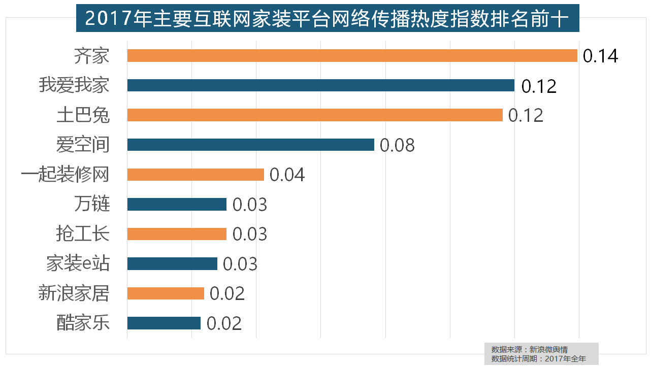 除各保守家拆设想企业逐鹿我国度拆市场外,一众互联网家拆平台也前来分一杯羹。据新浪微舆情对我国次要互联网家拆平台大数据阐发显示,2017年,齐家、土巴兔、爱空间、一路拆修网的收集热度指数排名前五,万链、抢工长、家拆e坐、新浪家居、酷家乐正在年度互联网家拆平台热度榜上排名第六到第十位。